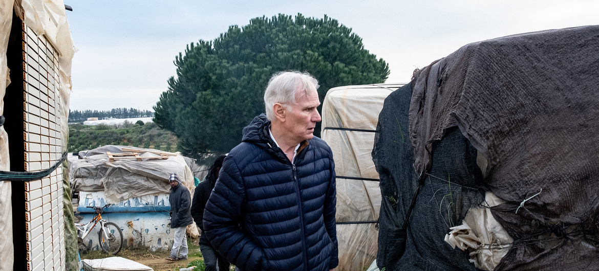 Philip Alston en su visita a un campamento de trabajadores migrantes en la ciudad española de Huelva, en Andalucía // Bassam Khawaja