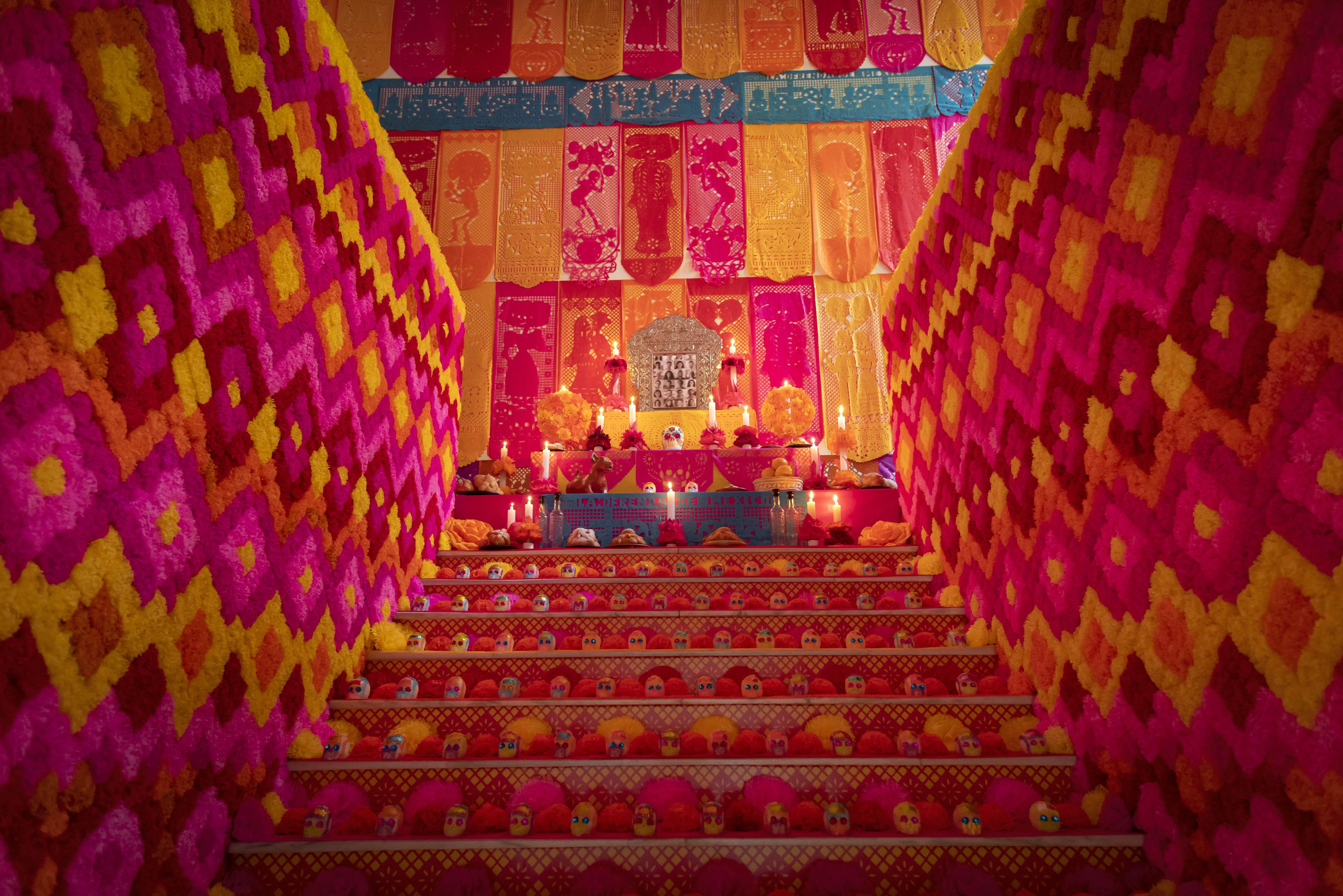 Este tradicional altar, el tercero que realizan desde 2018, ha sido creado con papel picado y cerca de seis mil flores de papel y este año, está dedicado a todas las personas fallecidas por la pandemia del coronavirus.