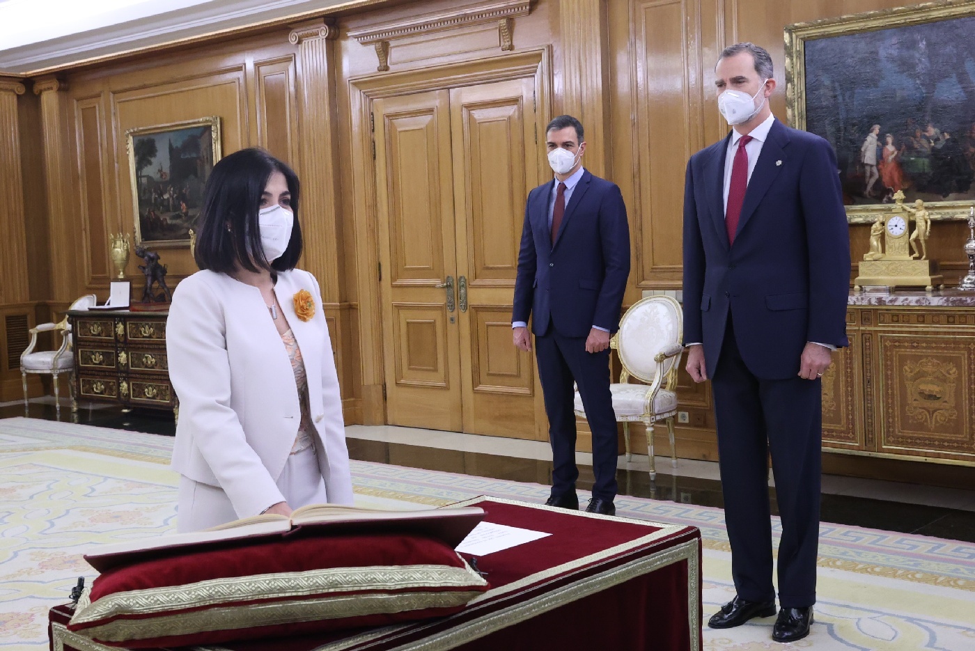 La ministra de Sanidad, Carolina Darias, jura su cargo ante el Rey Felipe VI y el presidente del Gobierno, Pedro Sánchez en el Palacio de la Zarazuela // Casa Real