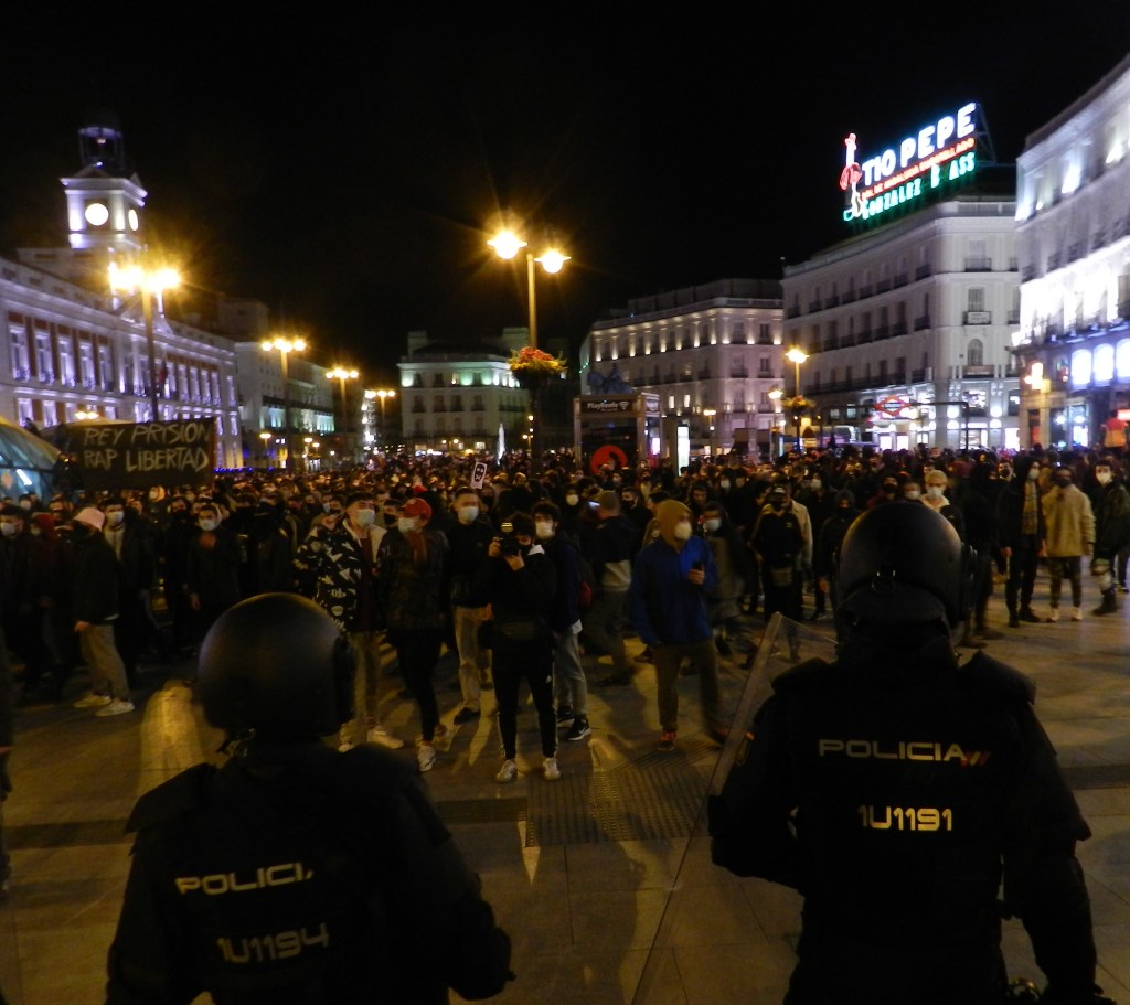 A las 19 horas comenzaba la protesta en la que centenares de personas pedían la libertad de Hasél, con pancartas que decían “Pablo Hasél, secuestrado por el terrorismo de Estado ¡Amnistía total! “. Esta concentración, fue convocada por el Movimiento Antirrepresivo de Madrid, sumándose así a las más de 30 ciudades que, bajo el lema de «Secuestrados por el Estado, ¡Todos a la calle!», organizaron protestas. Sin embargo, esta protesta no fue comunicada en la Delegación del Gobierno.