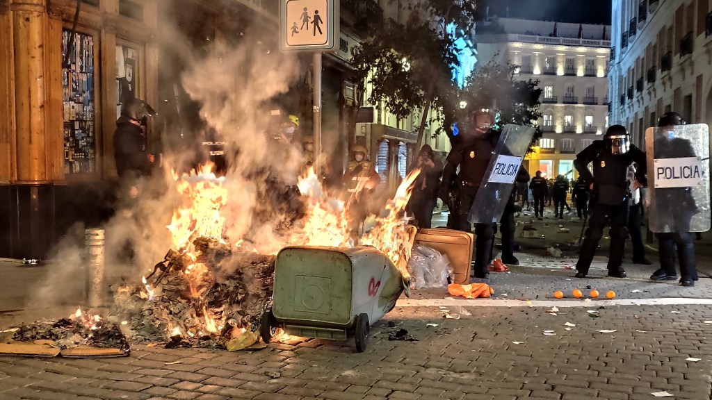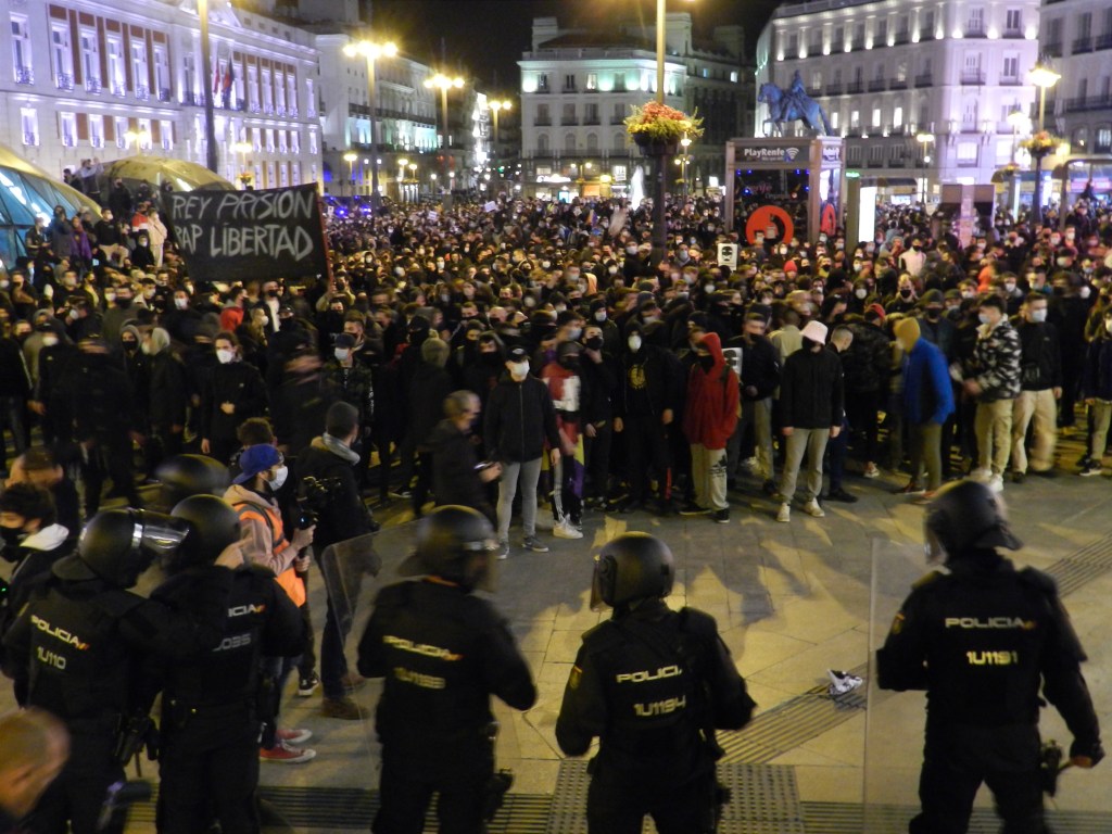 Cientos de personas protestaron este miércoles en la Puerta del Sol de Madrid contra el encarcelamiento del rapero Pablo Hasél, lo que desencadenó actos de violencia y enfrentamientos entre los manifestantes y la policía