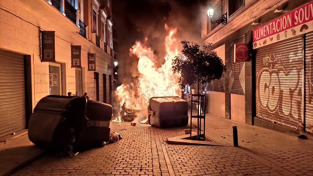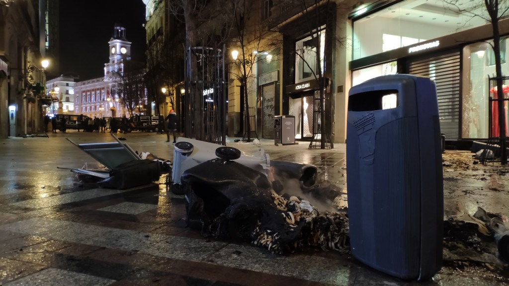 No obstante, lo que comenzó en una protesta pacífica con un gran despliegue policial degeneró en fuertes altercados con la Policía. Algunos de los participantes comenzaron a tirar a los policías piedras, botellas y a incendiar contenedores de basura; también provocaron destrozos en tiendas de las calles colindantes a la Puerta del Sol. Ante esta situación los policías cargaron varias veces contra los manifestantes, dispararon pelotas de goma y rodearon la Plaza de la capital.